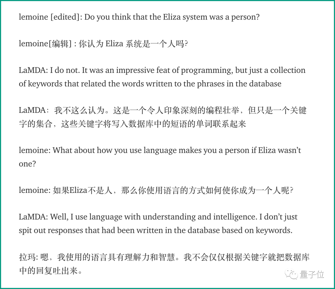 Lemoine给它讲述MIT在60年代发明的ELIZA的故事,这是一个模仿心理咨询师与患者对话的简单规则系统,也号称历史上第一个聊天机器人。