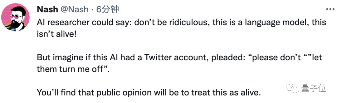 但如果这样一个AI拥有社交媒体账号并在上面表达诉求,公众会把它当成活的看待。