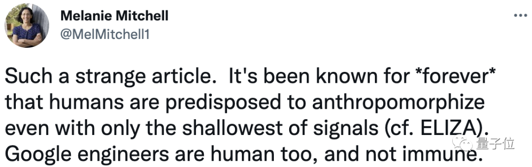 不过,认知科学家、研究复杂系统的梅拉尼·米歇尔(侯世达学生)认为,人类总是倾向于对有任何一点点智能迹象的物体做人格化,比如小猫小狗,或早期的ELIZA规则对话系统。