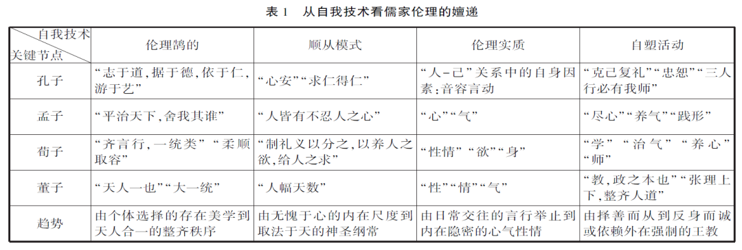 以上的解析可以带来怎样的发现呢?我们不妨以一张简洁的表格,来显示从自我技术的四个维度所能看到的早期儒家思想的嬗变轨迹(见表1)。