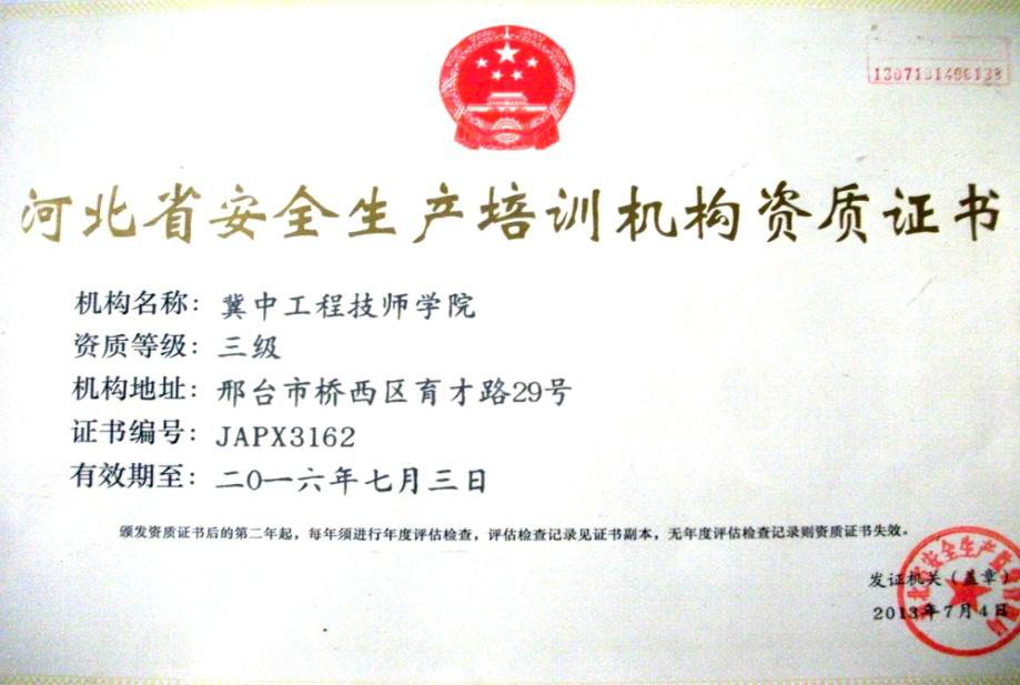 我校为国家安监局批准的“煤炭二级”和省安监局批准的“非煤三级”安全培训机构,是邢台市安监局指定的“人员密集场所培训”基地,开展煤矿安全培训、特种作业安全培训、安全管理人员安全培训、危化品押运员培训等。本年度,我校又自筹资金18万元对安全培训实操中心的设备进行了升级,使安全培训的功能得到进一步完善和提升。今年共计完成各类安全培训7050人,为提高邢台市企事业职工安全操作水平和管理人员的安全管理水平做出了突出的贡献。