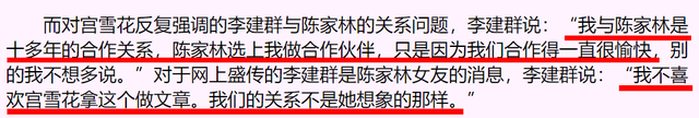 对于宫雪花这种说法,李建群很不满,她直言说“不喜欢宫雪花拿这个做文章”,并且强调自己和陈家林是多年合作的关系。