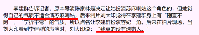 李建群说原本陈家林想让她演苏麻喇姑,这个角色现在说法是“人设很好”,也算善终,但李建群认为自己不适合。