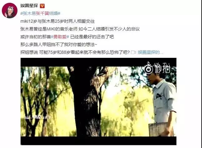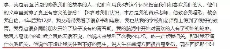 但张木易在Mika12岁时牵手公布恋情、发单曲且定期微博秀恩爱的行为不假,所以这段“爱情”从一开始就是一个心智成熟的大人对一个早熟女童的引导、暗示和养成。