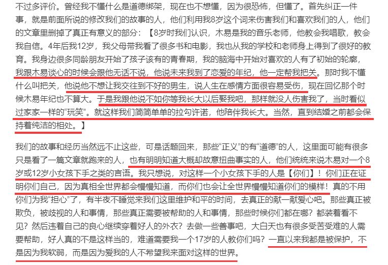 还有,她指责那些“正义的有道德的人”只是在歪曲事实,批评张木易“恋童”的人都是”道德绑架“。
