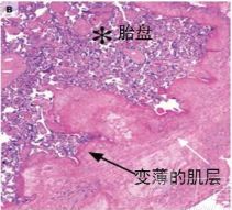 被破坏边缘的组织镜下可见胎盘直接长入到了已破坏的子宫肌层