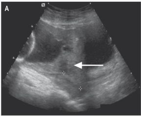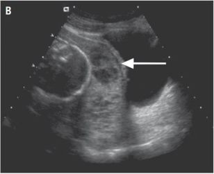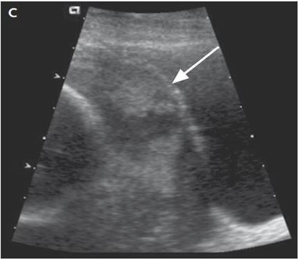箭头指的正常子宫肌层的回声带缺失,胎盘侵入了子宫肌层。