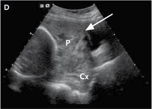 P指不规则低回声区,为胎盘组织;Cx指宫颈;箭头指子宫肌层。