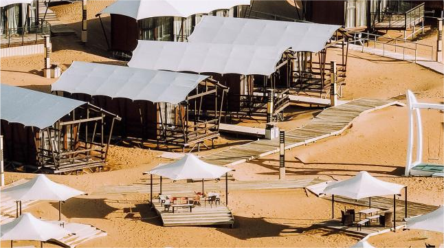 春夏秋冬三季,游客不仅可以体验滑沙、骑骆驼、沙地越野车等沙漠项目,还可以在沙漠休闲水世界畅玩水上蹦蹦床、水上滑梯、水上小跳圈、水上排球等。