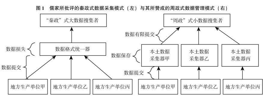 先来看第一个预设。首先可以确定的是,除了来自于阴阳家与道家的思想外援之外,早期儒家并没有一个具备足够“儒家特色”的关于物质世界的独有理论,而汉儒对于谶纬学说的颇受后世诟病的利用,在很大程度上又体现了儒家在“自然描述与自然解释”方面的随意态度。但积极地看,这种随意态度反过来亦说明了儒家对于西方自然科学描述体系可能的开放态度,而这一点的确也在徐光启、徐继畲、曾国藩、张之洞等在儒家背景中所成长起来的开明思想家或政治家的言行中得到了有力的注解。按照同样的理路,我们完全可以设想一个对科学抱有开放心态的现代儒家,能够完全接受对于物质生产的现代信息隐喻,并经由这种隐喻为自己的儒家小数据主义作出新的论证。譬如,他完全可以说:不同的地方性物质-知识生产单位所具有的内部数据格式具有明显的彼此不可通约性,而对于这些数据的统一化处理,反而会因为武断地规定统一的“度量衡”,而最终导致对于原始乡土信息的褫夺与忽略。换言之,与“大数据”这个词的字面含义的蕴意相反,暗含了纵向管理权威的大数据技术,恰恰会因忽略底层数据的丰富性而导致数据丢失;而与之相对应,将这种纵向管理权威化解为文化共同体内部的“小权威”的儒式小数据主义,反而才可能更有效地防止乡土数据的“水土流失”。两者之间的对比关系,或许可以通过图1得到更直观的说明。