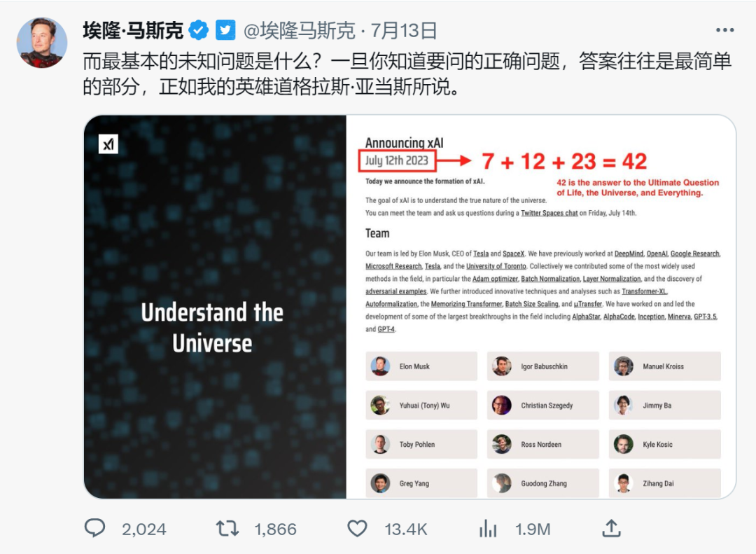 在图片上,马斯克用红色凸显“7+12+23=42”,看来官宣的日期是被精心设计的。“42”是科幻小说《银河系漫游指南》中“生命、宇宙和一切的意义”这个终极问题的答案,这让xAI又裹上一层奇异的色彩。