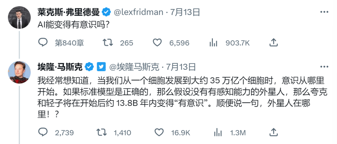 马斯克对莱克斯·弗里德曼(麻省理工学院研究科学家)“AI能变得有意识吗?”这个问题的回复也是玄乎其玄,还“反杀”出一个问题“外星人在哪里?”
