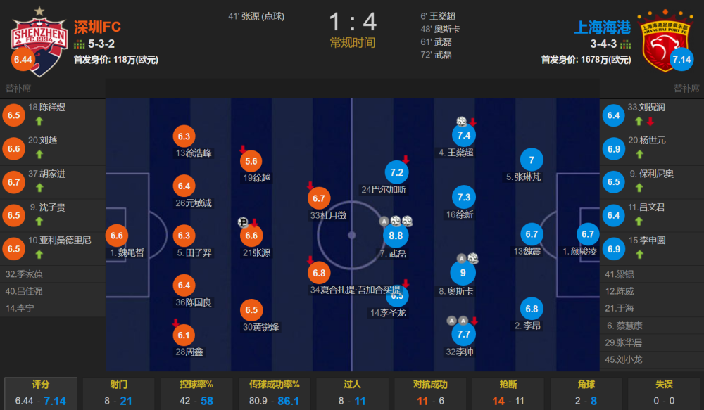 一场一边倒的比赛,全场比赛上海海港的控球率为58%,一共有21次射门,其中9次射正;深圳是8次射门,其中4次射正。