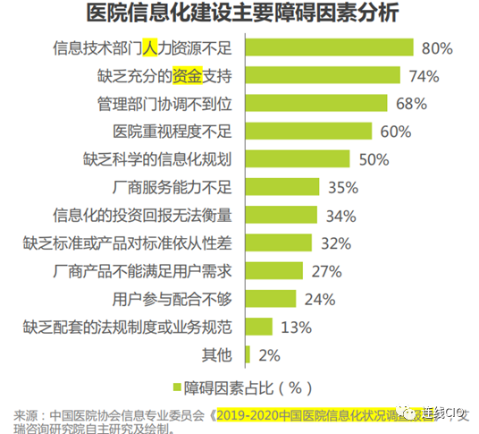 中国医院协会信息专业委员会发布的《2019-2020中国医院信息化状况调查报告》显示,医院信息化建设的主要障碍有:信息人力不足、资金不足、医院不够重视、厂商服务能力不足等。