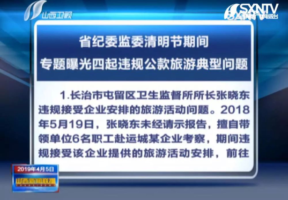 1. 长治市屯留区卫生监督所所长张晓东违规接受企业安排的旅游活动问题。2018年5月19日,张晓东未经请示报告,擅自带领单位6名职工赴运城某企业考察,期间违规接受该企业提供的旅游活动安排,前往关帝庙等景区旅游。此外,张晓东还存在其他违纪问题。2019年2月,张晓东受到党内严重警告、政务记过处分。