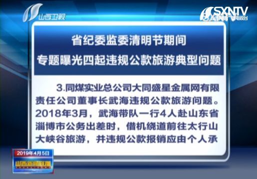 3. 同煤实业总公司大同盛星金属网有限责任公司董事长武海违规公款旅游问题。2018年3月,武海带队一行4人赴山东省淄博市公务出差时,借机绕道前往太行山大峡谷旅游,并违规公款报销应由个人承担的相关费用。2018年12月,武海受到党内警告处分,被责令退交违纪所得。