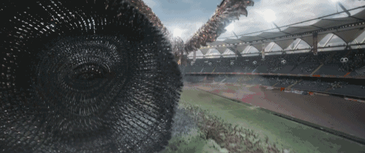 还把成千上万的手机组合到一起,变成一只愤怒的大鸟,所过之处尽皆废墟: