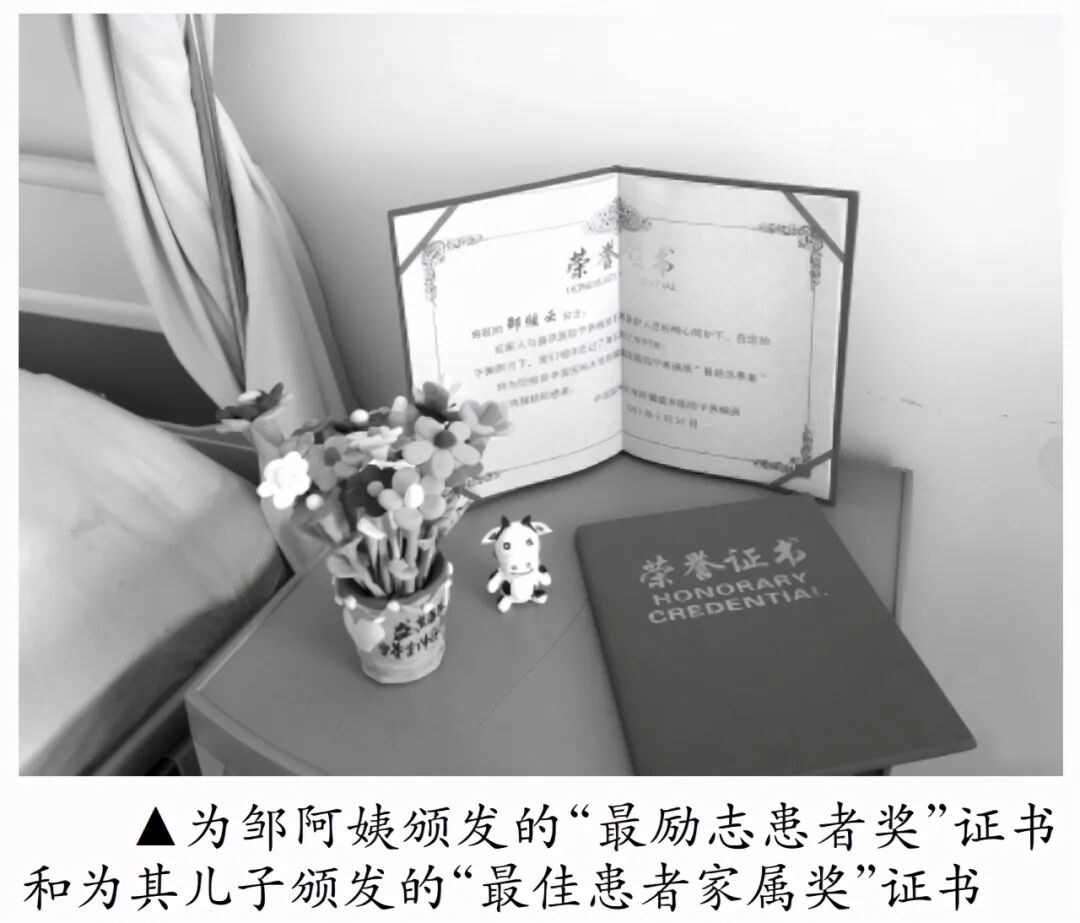 “尊敬的邹继云女士:在家人与盛京医院宁养病房全体医护人员的精心呵护下,在您的不懈努力下,我们相伴走过了难忘的三年时光。特为您颁发中国医科大学附属盛京医院宁养病房‘最励志患者’奖,以资鼓励和感谢。”