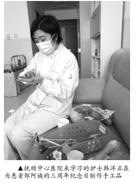 行文至此,本期的“特别关注”也即将完结,但对于宁养病房的所思、所感,似乎还有许多笔触蔓延纸外,无法一一细说。尤记得那日,我帮抚顺市中心医院来盛京医院学习的韩洋护士一起为邹阿姨准备三周年纪念日的手工花朵,她笑嘻嘻地跟我讲着这些天在宁养病房的学习收获,突然抬头问我:“你说,如果有一天,我们需要住进宁养病房的话,你会第一时间过来吗?”我一愣,一时不知如何回答。她又说:“我们天天在这里,见证别人的生与死,所以我常常想,如果有一天,我能接受自己的死亡吗?”