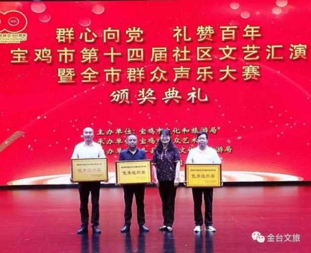 在宝鸡市第十四届社区文艺汇演暨全市群众声乐大赛中,我区选送歌手梁蓉、赵芳的《红旗颂》《不忘初心》分获民族类唱法一等奖和优秀奖,金台区获得优秀组织奖,受到市文旅局的表彰。