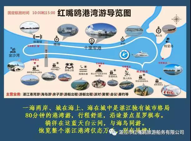 这是“港湾游”的线路图,乘坐约80分钟的红嘴鸥游船畅游港湾,可以将湛江一湾两岸的美景尽收眼底。湛江市是一座美丽的滨海城市,三面环海,海岸线长达2043.5公里,旅游资源丰富,被众多岛屿环抱着的湛江港湾是世界上最安全的游览海域之一,也是一个集军港,渔港,商港和旅游观光为一体的美丽港湾。湛江中心城区沿美丽的湛江湾而建,一湾两岸,城在海上,海在城中是湛江独有的城市格局。