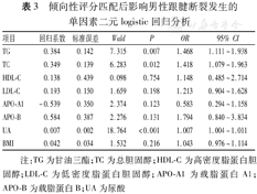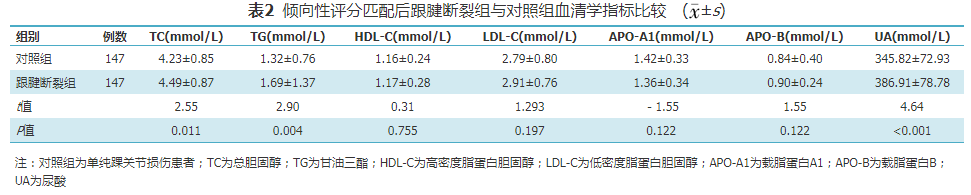 本研究的主要目的是比较跟腱断裂和对照组的一般资料及血清学指标,通过倾向性评分匹配控制基线混杂因素,均衡跟腱断裂组和对照组间基线的差别,合理地减少混杂因素,并以此体现出研究因素与结局之间的真实关系。为了尽可能实现结果的准确性,笔者排除了既往已得到证实的跟腱断裂的某些危险因素(如全身或局部使用类固醇药物,喹诺酮类药物)。多因素logistic回归分析方法的结果显示,UA、TC是影响跟腱断裂发病的独立危险因素,对跟腱断裂的发生有显著影响。