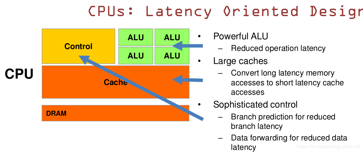 CPU 是一种低延迟的设计: ??? CPU 有强大的 ALU(逻辑运算部件),时钟频率很高;??? CPU 的容量较大的 Cache,一般包含 L1、L2 和 L3 三级高速缓存。其中 L3 可以达到 8MB,这些 Cache 占据相当一部分的片上空间;??? CPU 有复杂的控制逻辑,例如:复杂的流水线(pipeline)、分支预测(branch prediction)、乱序执行(Out-of-order execution)等;