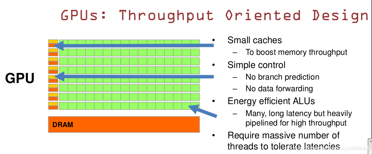 GPU 是一种高吞吐的设计: ??? GPU 有大量的 ALU;??? Cache 很小,缓存的目的不是保存后面需要访问的数据的,而是为 Thread 提高服务的,这点和 CPU 不同;??? 没有复杂的控制逻辑,没有分支预测等这些组件;