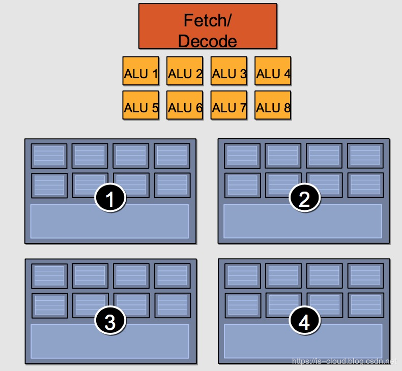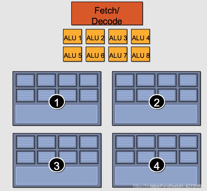 一个 GPU Core 包含 8 个 ALU,4 组执行环境(Execution context),每组有 8 个Ctx。这样,一个 Core 可以并发(Concurrent but interleaved)执行 4 条指令流(Instruction Streams),32 个并发程序片元(Fragment)。