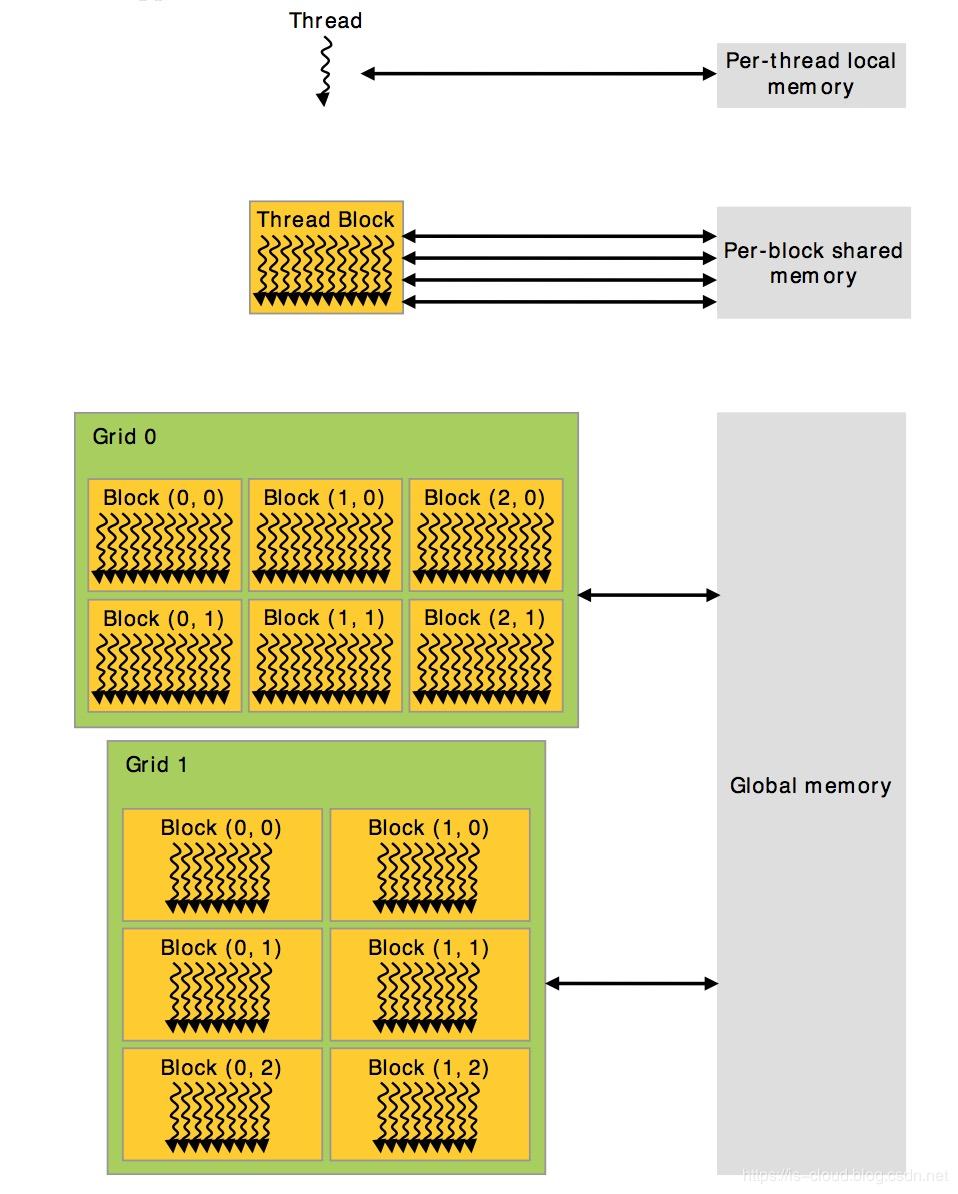 假设,我们先简单的把 GPU 当作拥有上百个核的 CPU,kernel 当成一个要创建为线程的函数。所以,CUDA 现在就要将你的 kernel 创建出上百个 thread,然后将这些 thread 送到 GPU 中的各个核上去运行,但为了更好的利用 GPU 资源,提高并行度,CUDA 还要将这些 thread 加以优化组织,将能利用共有资源的线程组织到一个 thread block 中,同一 thread block 中的 thread 可以通过 share memory 共享数据,每个 thread block 最高可拥有 512 个线程。拥有同样维度同样 kernel 的 thread block 被组织成一个 grid,而 CUDA 处理任务的最大单元便是 grid 了。