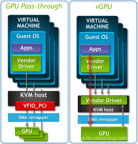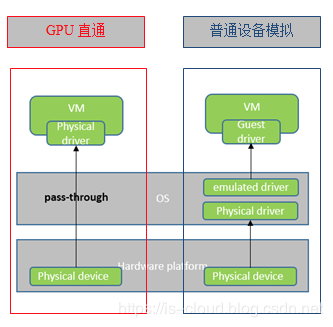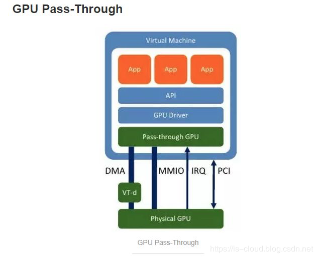 而 GPU Pass-Through 技术则可以绕过 Hypervisor,通过将 Host 上 GPU 设备的 PCI 内存地址映射给云主机,将 GPU 设备直接加载给云主机进行使用,虚拟机看到的该设备,就完全是一块物理卡。