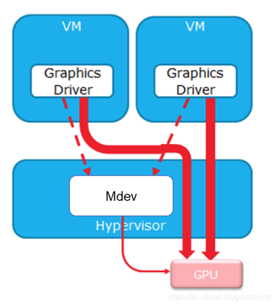 NIVDIA vGPU 的设计主要实现了 Mediated Passthrough(分片透传)。Mediated Passthrough 是一种完全软件定义的 GPU 虚拟化解决方案,其技术原理主要为:对于与 GPU 性能相关的访问直接透传给云主机,把与性能无关功能的相关访问在 Mdev 模块中来模拟实现。Mdev 是此方案的关键技术,简单解释一下,Mdev 即 mediated 设备框架,能够驱动 VFIO 框架及接口支持虚拟 PCI 设备,因此也就能够完全基于软件实现,将宿主机上的物理 GPU 切分成为多个虚拟 GPU 设备并进行共享。