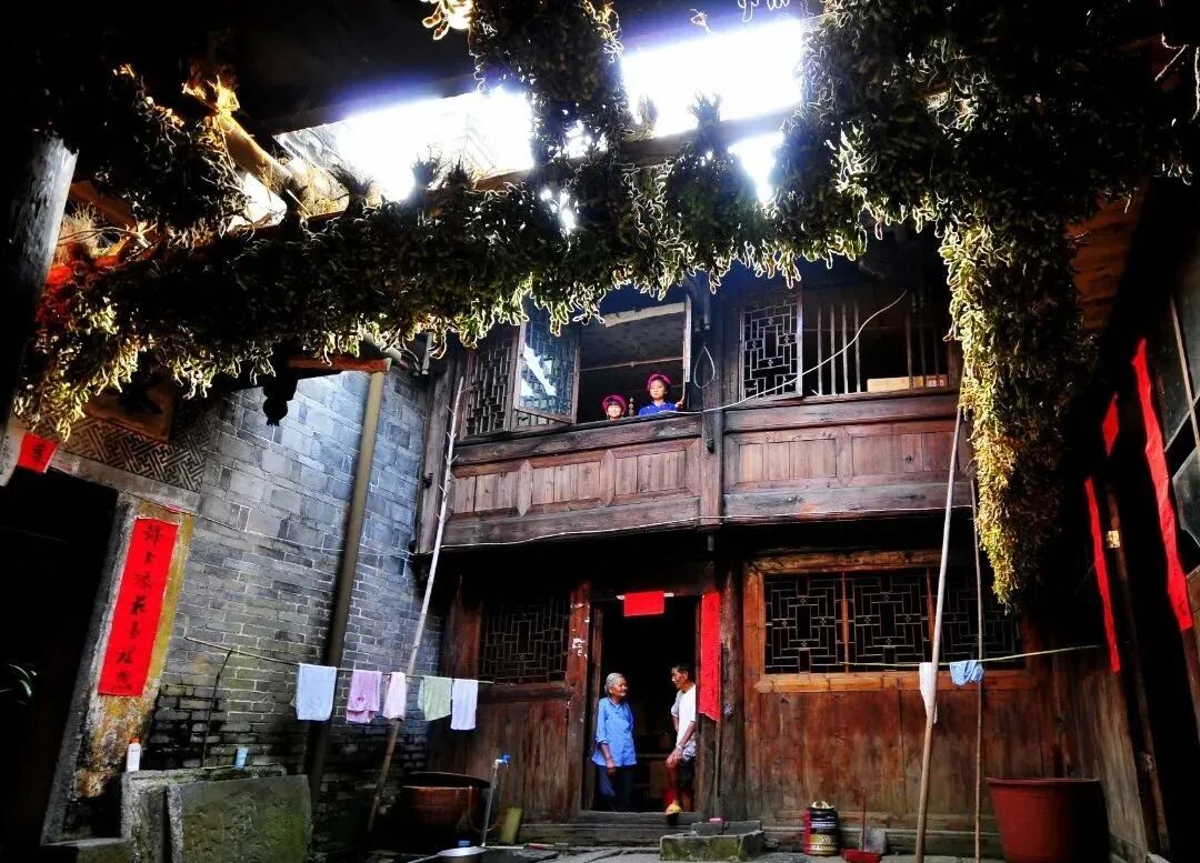 将村寨串联为一体的是四通八达的街道。三门塘连通村里,连接外界的道路,全用石板或鹅卵石铺就。一尘清雨洒过,清鉴照人。路道进入寻常人家,因坐向各异,往往又极尽弯环,处处见出“长生”“延年”“定门”的玄机。外在尚且如此,内宅就更不必说了。三门塘的民居,有木房和砖房两种。木房多由天井、厢房、正房构成,设内走廊或外走廊。内走廊者,上身雕花窗;外走廊者,下身着栏杆。屋架纵向穿枋,悉皆朝向堂屋坐山左中柱,谓一家有主,团结和睦,家政有道。房屋的板壁,每年伏天,都会用桐油擦拭,以防风化潮腐。诸多百年老屋,至今依然敞亮如新。