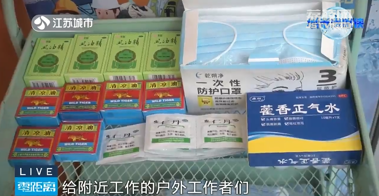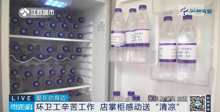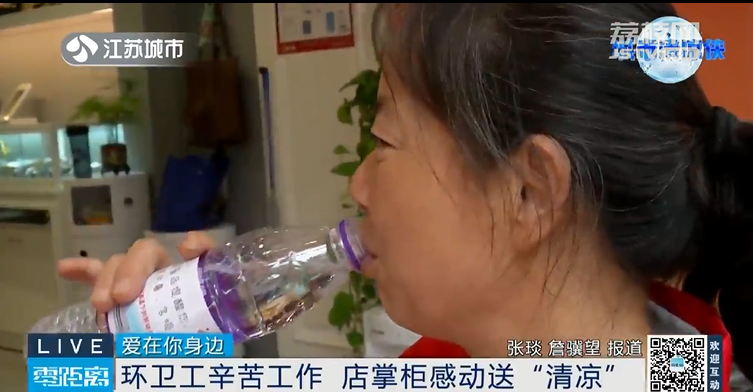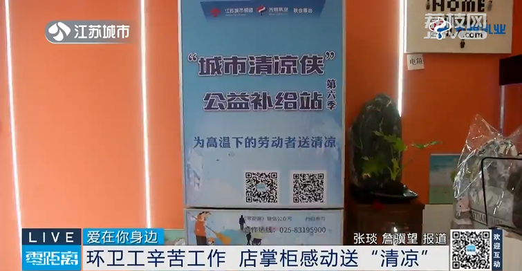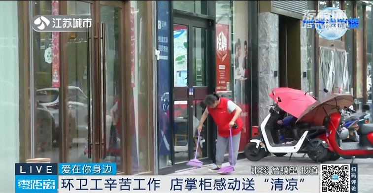 四年如一日,每天尽心尽力地为周边商铺维护环境卫生,陆金华认真负责的工作态度感动了很多人。在她负责的街道里,一家商铺在了解到江苏城市频道“城市清凉侠”公益补给站活动后,决定加入其中,为陆师傅以及更多的户外工作者提供一处休息港湾,店铺老板也准备好清凉物资供户外工作者免费使用。