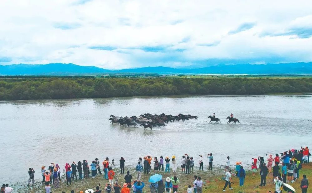 2022年7月19日,游客在昭苏湿地公园观看“天马浴河”。伊犁日报 记者 刘春星 摄