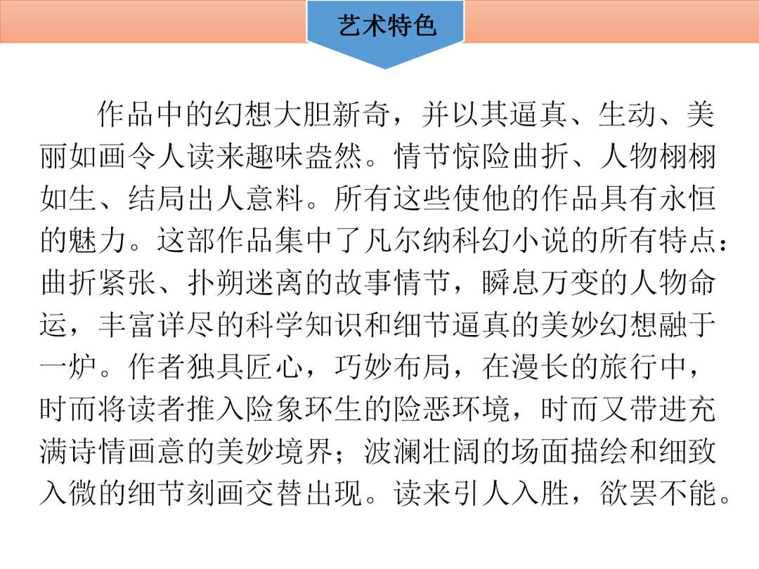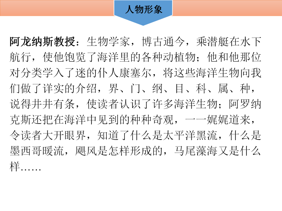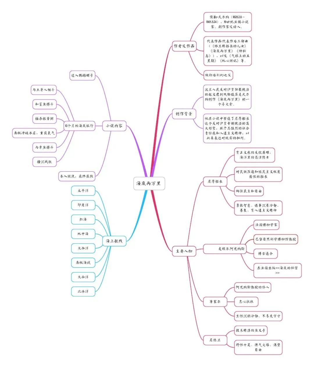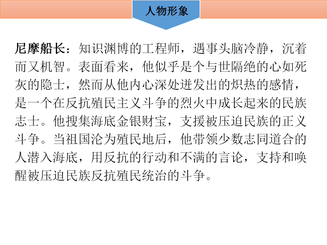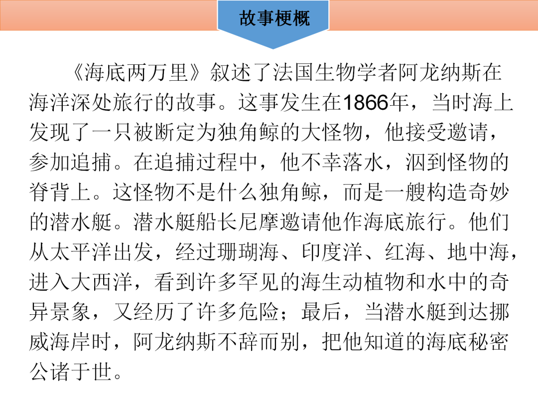 【创作背景】波兰人民反对沙皇独裁统治的起义遭到残酷镇压是凡尔纳创作《海底两万里》的一个导火索。他在小说中塑造了尼摩船长这个反对沙皇专制统治的高大形象,赋予其强烈的社会责任感和人道主义精神,以此来表达对现实的批判。【内容简介】《海底两万里》是凡尔纳三部曲的第二部。这部作品叙述法国博物学家阿龙纳斯教授在海洋深处旅行的故事。故事发生在1866年,法国生物学家阿龙纳斯教授,应邀赴美参加一项科学考察活动。这时,海上发现了一只疑似为独角鲸的大怪物,阿龙纳斯教授及仆人康塞尔,受美国海军部的邀请,参加追捕活动。在追捕过程中不幸落水,泅到怪物的脊背上。其实这怪物并非什么独角鲸,而是一艘构造奇妙的潜水艇。潜艇是船长尼摩在大洋中的一座荒岛上秘密建造的,船身坚固,利用海洋发电。尼摩船长邀请阿龙纳斯作海底旅行。他们从太平洋出发,经过珊瑚岛、印度洋、红海、地中海,进入大西洋,看到许多罕见的海生动植物和水中的奇异景象,又经历了搁浅、土著人围攻、同鲨鱼搏斗、冰山封路、章鱼袭击等许多险情。最后,当潜艇到达挪威海岸时,阿龙纳斯不辞而别,把他所知道的海底秘密公布于世。如何用一句话概括《海底两万里》主要内容:主要讲述法国生物学家阿龙纳斯发现一艘潜艇,并且带着仆人康塞尔和一个捕鲸手,跟随尼摩船长乘坐这艘鹦鹉螺号潜艇在海底作了两万里的环球探险旅行的故事。【作品主题】《海底两万里》描绘的是人们在大海里的种种惊险奇遇。美妙壮观的海底世界充满了异国情调和浓厚的浪漫主义色彩,体现了人类自古以来渴望上天入地、自由翱翔的梦想。小说不但能激发人们对科学的兴趣,而且赞扬了像尼摩船长等反抗压迫的战士的形象,体现了他们具有社会正义感和崇高的人道主义精神。【艺术特色】1.构思巧妙,情节惊险。 2.科学与幻想巧妙结合。3.场面描绘与细节刻画交替出现。4.人物具有社会正义感和崇高的人道主义精神【阅读感受】1.这部小说情节曲折,描绘生动,引人入胜。2.科学与幻想巧妙结合,激发人们对科学的兴趣,更能启发人们的思考。3.人的想像力比知识更重要。【推荐理由】我喜欢《海底两万里》,因为作者描绘了人们在大海里的种种奇遇。美妙壮观的海底世界充满了异国情调和浪漫主义色彩,体现了人们自古以来渴望上天入地,自由翱翔的梦想。而且,在这本书中,我明白了我们在科学技术造福人类的同时,重视防止被坏人利用,危害人类自身的行为,还有,我们要保护海豹、鲸鱼等海洋生物,谴责滥杀滥捕的行为。关于作者凡尔纳,他被称为“现代科学幻想小说之父”。而我认为他是一个具有社会主义感和崇高的人,他笔下的人物都是品质高尚,献身科学,是英勇顽强,不畏艰险的人。就如小说中的人物尼摩船长一样,他那样反抗压迫的战士形象,正是反对殖民主义,反对奴隶制和压迫者的进步思想体现。书,读多了是有好处的。所以我向大家推荐这本我最喜爱的书《海底两万里》。相信你们读完后,都有一个美好的探险旅程。【人物形象】1.尼摩船长尼摩船长(Capitaine Nemo,又译内摩船长、内莫船长)是小说里的主人公,在书中并未说明其国籍。他的真实身份在《神秘岛》中才得以揭晓:其为印度的达卡(Dakkar)王子。尼摩是个有正义感的反抗英雄,他对民族压迫和殖民主义极端痛恨,向往民主与自由。反抗失败后的尼摩选择了归隐大海,他曾经对阿龙纳斯说“海上极度太平。海洋不属于暴君。在海面上暴君们还能行使不公平的权利,他们可以在那里战斗厮杀,把陆地上的种种恐怖都带到海面上来。但是,在海面以下三十英尺的地方,他们的权利就不起作用了,他们的影响就消失了,他们的势力消失得踪影全无”。他甚至宁愿葬身于大海深处,在安静、不受鲨鱼和人侵害的珊瑚坟墓里长眠。大海给予了尼摩以平静和心灵的抚慰,但却无法驱逐他内心深沉的孤独感,只有在管风琴编织的梦幻中,他才能得到片刻的陶醉和安宁。因此,长期与世隔绝的生活使尼摩变得冷漠、残酷、不近人情,他反对奴隶制,向往自由,却还要将他的暴力强加于人,他时不时把阿龙纳斯一行囚禁起来,强迫他们睡觉,并且强制他们永远留在鹦鹉螺号上。对殖民者的痛恨使尼摩由一种愤世嫉俗的情绪转变成了时间也无法磨灭的深仇大恨,这种扭曲了的畸形的仇恨促使他展开了疯狂的海上复仇计划。他领导船员击沉了一艘又一艘战舰;他亲手制造了一场大屠杀,并且亲眼看着爆炸的战舰和上面的受难者一点一点地沉到海底。他已经从一个令人望而生畏的伸张正义的人变成了一个不折不扣的残酷的复仇者。然而另一方面,尼摩又是一个有博爱之心的勇士,有着为人类献身的崇高精神。他请求阿龙纳斯教授为伤势严重的部下治疗,面对水手的死尼摩甚至情绪激动地留下了眼泪,并且为他举行了庄严隆重的珊瑚王国的葬礼;看到印度采珠人被鲨鱼袭击,他“奋不顾身地站了起来,拿着匕首直朝大鲨鱼冲去,和鲨鱼进行肉搏”,还慷慨地送给采珠人一袋珍珠维持生计。虽然脱离了世俗社会的生活,尼摩仍然以慈爱之心关注着被压迫国家的人民。他定期地将装有金银财宝的箱子交给固定的联系人,为殖民地人民的反抗斗争提供物质援助。不管迫使他到海底寻求自由的原因是什么,他首先是一个人,他仍然为人类的痛苦而
