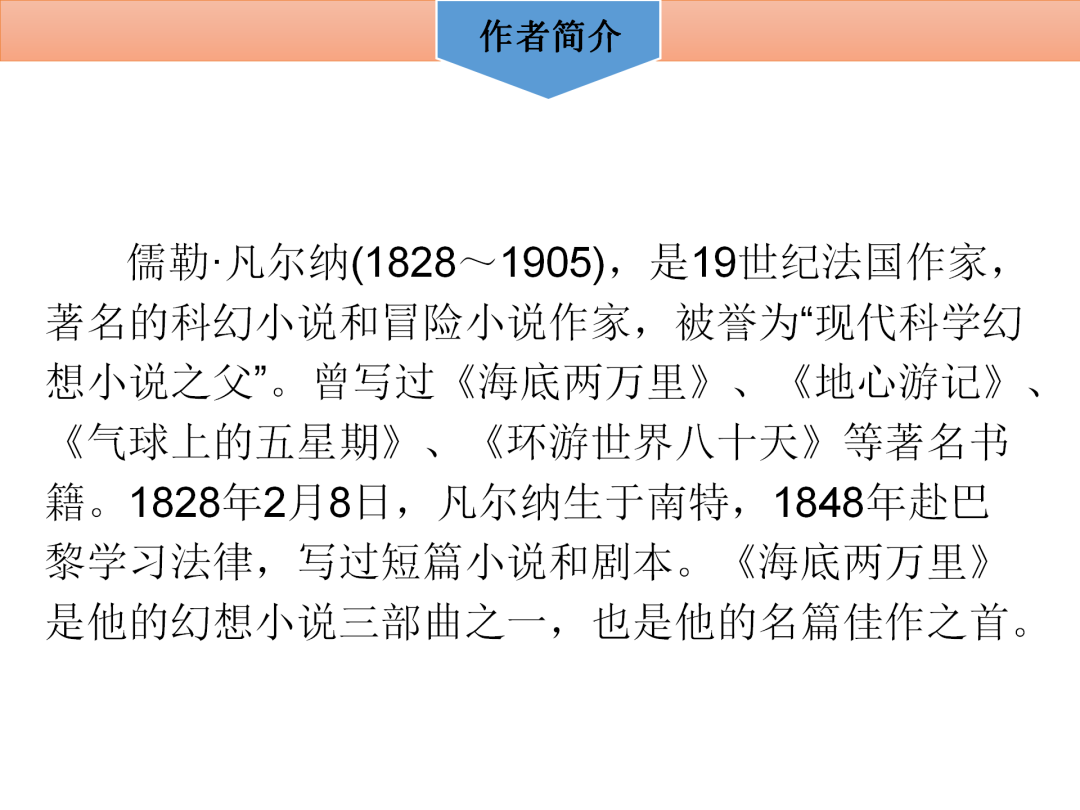 【作者简介】儒勒·凡尔纳:19世纪法国著名作家。生于海港城市南特,自幼喜欢航海,曾擅自离家做水手。1848年到巴黎学习法律,毕业后却去了剧院做秘书,写剧本,并热衷于各种科学的新发现。1863年,因出版《气球上的五星期》而一举成名,从此开始职业创作。他一生写有60多部科幻小说,大部分作品收录于总题为《在已知和未知的世界中的奇异漫游》的作品集。其中《格兰特船长的儿女》《海底两万里》和《神秘岛》被称为“凡尔纳三部曲”。他的作品对科幻文学流派有着重要的影响,他也因此被誉为“现代科学幻想小说之父”。