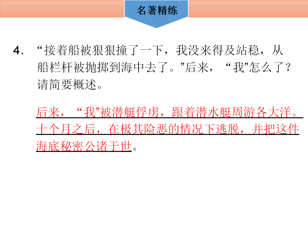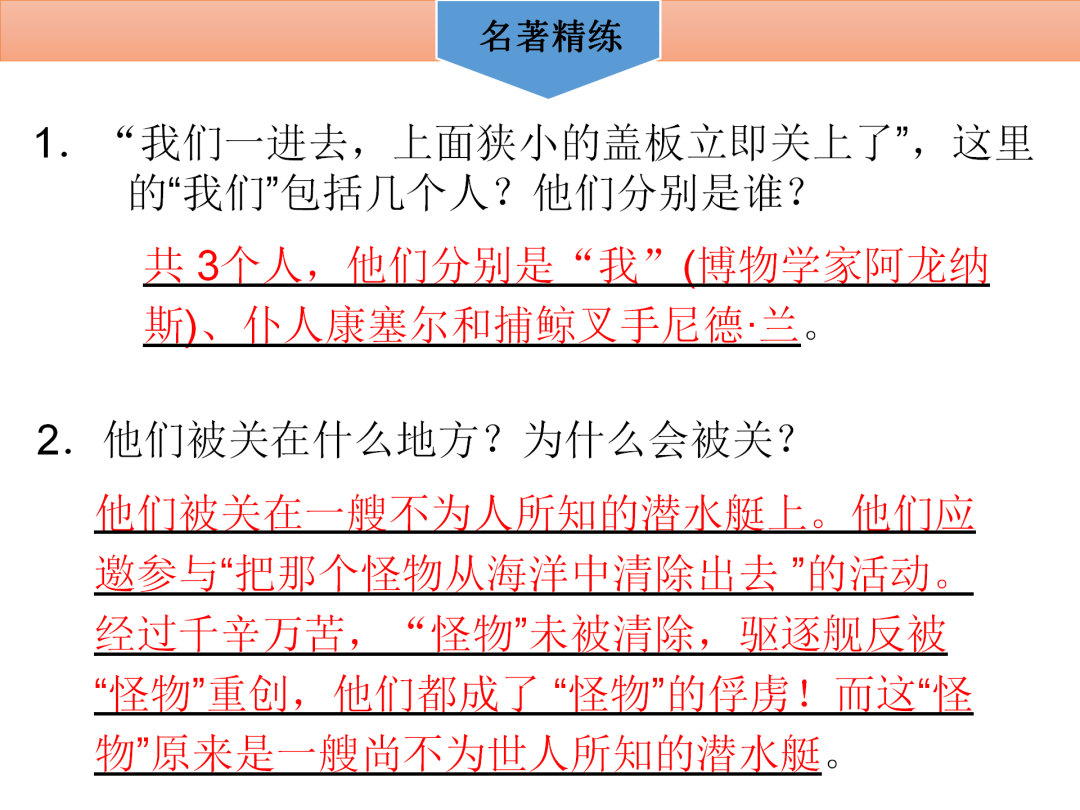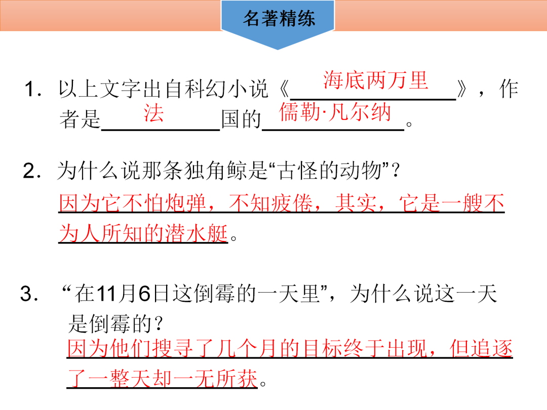 【习题精练】一、填空题1.凡尔纳是(法)国的科幻小说家,被公认为是“(现代科学幻想小说之父)”。《海底两万里》是他三部曲的第二部,第一部是(《格兰特船长的儿女》),第三部是(《神秘岛》)。2.凡尔纳的作品形象夸张地反映了19世纪“(机器时代)”的人们征服自然,改造世界的意志和幻想,并成为(西方)和(日本)现代科幻小说的先河,我国的科幻小说大多也受到他作品的启发和影响。3.凡尔纳的小说之所以动人,原因在于(构思巧妙)、(情节惊险)、是(科学与幻想)巧妙结合的成果。4.《海底两万里》中人物寥寥,有名有姓的只有四个半,即船长(尼摩)、生物学家(阿龙纳斯)、他的仆人(康塞尔)和捕鲸手(尼德?兰)。“亚伯拉罕?林肯”号驱逐舰舰长(法拉格特),只在小说开头部分昙花一现,姑且算半个。5.《海底两万里》中诺第留斯号潜艇是船长尼摩在大洋中的一座荒岛上秘密建造的,船身坚固,利用(海洋)发电。6.《海底两万里》中人物在印度洋的采珠场和(鲨鱼)展开过搏斗,捕鲸手尼德?兰手刃了一条凶恶的巨鲨;他们在红海里追捕过一条濒临绝种的(儒艮),它的肉当晚就被端上了餐桌。7.凡尔纳18岁时在一次晚会上遇到一位胖绅士,这位胖绅士是(大仲马)。后来,凡尔纳与他合作创作了剧本(《折断的麦秆》)。再后来,凡尔纳又相继创作了(《气球上的五星期》)(《地心游记》)(《八十天环游地球》)等,他的所有作品都收录在一本总标题为(《奇异的旅行》)一书中。8.大仲马是把历史学融进文学,巴尔扎克把社会伦理学融进文学,凡尔纳则把(生物学)、(地理学)、(地质学)等学科融进文学。他的自传性作品是(《喀尔巴阡古堡》)。9.《海底两万里》中尼摩船长说了一句:“(人类进步的实在是太慢了)”来形容人类的进步。10.《海底两万里》题目中的“里”指的是(法里)。11.尼德?兰说,世界上的动物有两种,(好吃的)和(不好吃的)。后来他又说,世界上的人有两种,(倒霉的)和(不倒霉的)。12.船长的国籍是(印度),在(《神秘岛》)里有说明。13.读《鲁滨孙漂流记》,我们认识到它是一部描写一位孤独而顽强的冒险者的传奇;读《昆虫记》,我们认识到它是一部谱写昆虫生命的诗篇;读《海底两万里》,我们认识到它是一部(贯彻现实与虚幻的篇章)。(仿写)14.潜艇上的人睡的床是用(大叶藻)做的,穿的衣服是用(贝壳类的足丝)做的,用来写字的笔是用(鲸的触须)做的,墨水是用(墨鱼或乌贼的分泌物)做的,布是用(海洋纤维)做的。15.鹦鹉螺号上的藏书量是(12000)册,鹦鹉螺号的造价是(200)万法郎,鹦鹉螺号的最快速度是(每小时50海里)。16.请列举几种海底植物:(裙带菜)、(海带)、(紫菜)、(石花菜)、(鹅掌菜)。17.故事中,阿龙纳斯曾经在法国出版过一部书叫(《海底的秘密》)。18.《海底两万里》告诉我们,鲸鱼用(肺)进行呼吸。19.尼摩船长会说(四)种语言,分别是(法语、德语、英语、拉丁语)。20.尼摩船长邀请我们去打猎,打到了(鲨鱼)。21.在红海,尼德?兰用鱼叉杀死了一头(海马)。22.尼摩船长允许尼德?兰杀死海马,是因为(能为船上提供鲜肉)。23.北半球海洋中的水以(顺时针)的方向流动。24.尼摩船长用(热水)解除了被困在冰层中的危机。25.海洋中最多的生物是(浮游)生物。26.汇入大西洋的最长河流是(亚马逊河)。二、简答题1.尼摩船长和阿龙纳斯在海底环球探险旅行时,经历了许多险情,请列举其中几次。答:搁浅;土著人围攻;同鲨鱼搏斗;冰山封路;章鱼袭击等。2.请说出尼摩船长与阿龙纳斯教授在海底环球旅行的路线。 答:从太平洋出发,经过珊瑚海、印度洋、红海、地中海,进入大西洋、南极。3.为什么尼摩船长要将死去的同伴安葬在珊瑚丛中?答:因为珊瑚虫将永远封闭墓穴,不受鲨鱼和人的欺负。4.请简述《海底两万里》的内容。答:1866年,有人以为在海上见到了一条独角鲸,法国生物学家阿龙纳斯最后发现那是一艘名为诺蒂留斯号的潜艇,并且带着仆人康塞尔和一个捕鲸手,跟随尼摩船长乘坐这艘潜艇在海底作了两万里的环球探险旅行。5.读完这部小说,你有什么感受和启示?答:在我们的地球上,还有很多未知的,也可能是即将发生的事情,需要人们以一种求知的态度去看待。6.请简析尼摩船长的形象。答:尼摩船长是一位不明国籍的神秘人物,是杰出的建筑师、工程师、航海家和学者。他身材高大,目光犀利,有着哲人般的沉静,蔑视人类社会的法规。他勇敢刚毅,有着超人的智慧,乐观自信,富有同情心,崇尚自由独立,是一名富有正义感、反对压迫的战士。7.《海底两万里》是一部纯虚构的科幻小说,你觉得这部书最吸引你的地方是什么?书中哪些想象事物如今已成为现实?通过这些事例你能看出科幻小说与科技发展的某些关系吗?答:海底世界充满异国风情和浓厚的浪漫主义色彩。海底潜艇,人类登月、太空飞行都已成为现实。科幻小说往往也是在科学研究基础上的推理和预言。书中曲折的情节和对海洋知识的介绍,如潜水艇、潜水服、电的使用等等在一定程度上促进了科学的发展。8.爱因斯坦说过,人的想象力比知识更重要。阅读这部小说,人们往往会被作者巨大的想象力吸引。关于想象力的神奇魅力与想象力的作用,你有什么看法?答:想象往往是在现实之外,但又在情理之中。只要是符合实际的、合理的想象,就是正确的、好的想象。但是如果不切实际,不修边幅地胡乱想象,就是错误的、坏的想象。总