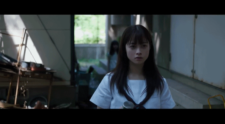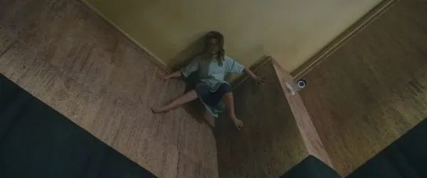 原来着地的小女孩,突然像蜘蛛一样爬上了天花板。(当然你说是倒放也行)