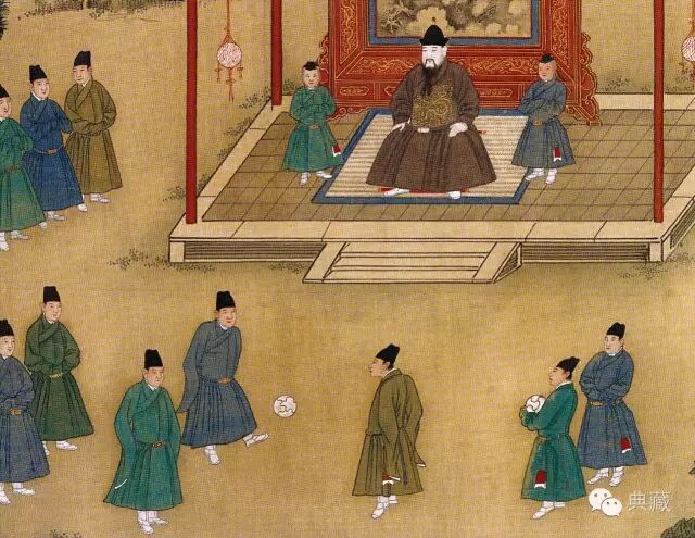 最能反映明代宫廷生活的行乐图,则包括北京故宫藏明人《宣宗宫中行乐图》卷(图5)、《明宣宗斗鹌鹑图》轴,以及中国国家博物馆藏的《成化元宵行乐图》卷等。《宣宗宫中行乐图》卷是表现宣宗皇帝在御园观赏各种体育竞技场面的长卷。全卷分六段,分别表现射箭、蹴鞠、马球、捶丸、投壶及皇帝起驾回宫场景;各段之间以宫墙或屏障隔开。画面中宣宗朱瞻基戴笠子盔帽,身穿浅色辫线袄式样长袍,宦官身穿青绿等色曳撒,显示出深受蒙元服饰影响。整幅画卷场面宏大而又具体入微,生动地表现出宫中的文体娱乐活动。全卷工整写实,是记录明代宫廷历史及宫殿建筑的重要图像资料。《成化元宵行乐图》卷则描绘明宪宗成化年间宫廷庆祝正月十五元宵节的场景。明宪宗形象在此卷中多次出现,皆为坐于御幄中观看表演。此卷首段为焰火,第二段为货郎,第三段为杂耍,第四段杂耍和舞队。开卷表现内官们手持花炮燃放的情景,气氛热烈欢快,皇子们手持莲花灯、蛙灯、马灯、鹤灯、象灯、人偶灯等游玩。杂耍表演分为变魔术和杂技,包括蹬车轮、钻圈等。整卷画面沉浸在祥和的气氛中。
