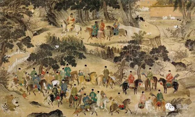 存世的宣宗行乐图有多幅,其中不仅有表现帝王休闲娱乐的传统行乐图题材,更有相当数量表现宣宗射猎情景的行乐图,这与其提倡并践行的武备精神有着紧密联系。如北京故宫藏商喜画《宣宗行乐图》轴(图4),即表现宣宗出行游猎的场景,画中人物众多,描绘细致。宣宗位于画面中心位置,身材魁梧,体态雍容,头戴尖顶圆帽,身着窄袖衣,率领随从骑马出巡。明初皇帝在日常生活中、尤其是骑射出行时的冠服,保留有金元遗制,图中宣宗的尖顶圆帽源自元代的“笠子帽”,无领无袖的大褂在元代称“比甲”,是射猎服。画家用忠于史实的画笔真实而又概括地描绘了历史场景,构图周密,景物起伏错落,人物穿插有序,显示出画家对场面的控制能力。北京故宫还藏有明人画《宣宗射猎图》轴,此图画心右旁贴有一条黄色小标,上题“明宣德御容行乐”。画家采用中国绘画传统的留白技法,将野外空旷的环境描绘得淋漓尽致。此图也反映朱瞻基自幼善射、重视武备的个人特点。