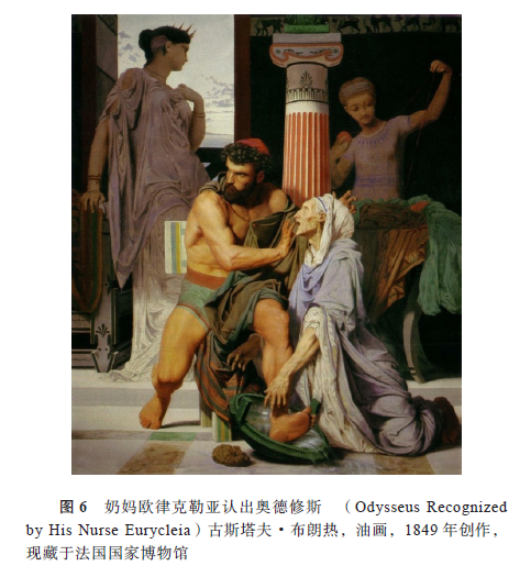 荷马时代(公元前12 世纪至9 世纪)的古希腊,斯巴达城的王后一般只给长子(也就是未来的国王)哺乳,余下子女交由奶妈抚育。各城邦贵族们纷纷效仿,聘请来自斯巴达的奶妈,因为他们相信斯巴达全民尚武的精神能随着奶妈的乳汁“转移”给自己的孩子们,让他们茁壮成长[10]。 婴幼儿的哺乳期通常长达几年,奶妈在哺育护理的同时,与孩子建立深厚的感情,行使类似母亲的教育职责,拥有较高的家庭地位或社会地位,这种奇特的社会现象在西方经典中可见一斑。《圣经》故事提到埃及法老的女儿收养了摩西,又恰好选中摩西的生母约基别担任奶妈,约基别才有机会教导摩西信仰上帝。荷马史诗《伊利亚特》记载伊塔卡岛国王奥德修斯(Odysseus)历经特洛伊战争和海上十年的漂泊,容颜大改,回到家乡后,包括妻子在内的众人都没有认出他,只有年迈的奶妈帮他洗脚时,见到他幼时膝盖上留下的伤疤,方才与之相认(图 6)。莎士比亚的《罗密欧与朱丽叶》描写奶妈在凯普莱特家族地位很高,上可顶撞朱丽叶的父亲凯普莱特伯爵,下可领导、训斥其他奴仆,甚至成为罗密欧和朱丽叶感情发展的关键推动者。