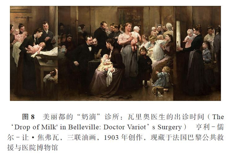 母乳喂养最终在 18 世纪占据了主导地位。法国大革命期间,母乳喂养的价值再次被提及,只不过增加了一层政治意味,那就是与腐朽的贵族划清界限[15]。1792 年,英国著名女权主义运动家玛丽 ? 沃斯通克拉夫特(Mary Wollstonecraft)发表了现代女权主义的奠基之作《女权的辩护》,认为女性应当亲自哺育子女,但这既不是生物学决定的,也不是社会学规定的,而是女性有权利做出这样的选择—在传统西方社会,女性被视为男性的漂亮玩偶,往往生育后为了尽快恢复身材而放弃母乳喂养,而自主决定并坚持母乳喂养是女性摆脱性别固化形象的关键一步[16]。 1793 年, 法国政府宣布不采取母乳喂养的妇女将失去获得社会福利的资格。巴黎著名剧作家博马舍(Pierre-Augustin Caron de Beaumarchais )把作品《费加罗的婚礼》所得的全部收益捐给了母亲福利协会,鼓励工人阶级的母亲坚持亲自喂养孩子[17]。 尽管随着科学技术的进步,法国微生物学家路易? 巴斯德(Louis Pasteur) 于1865 年发明的巴氏消毒法能杀灭牛奶里含有的病菌,使牛奶成为19 世纪婴幼儿的替代营养品[18], 但母乳喂养依旧是医学家关注的话题, 其中重要支持者之一是法国儿科医生加斯顿 ? 瓦里奥(Gaston Variot)。他在巴黎穷人聚集区“美丽都”开设一家叫“奶滴”的福利诊所,向前来咨询的母亲提供专业指导意见,宣传有关母乳喂养和营养学的知识(图 8)[19]。自此,母乳喂养的风潮迅速传遍整个法国,接着传播到英国,继而影响了整个欧洲大陆甚至全世界的哺乳观念。
