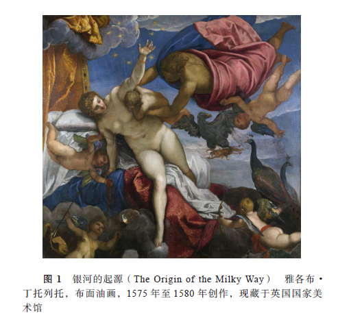 1575 年到1580 年, 意大利画家雅各布? 丁托列托(Jacopo Tintoretto)创作了一幅名为《银河的起源》的布彩油画(图 1),题材来自古希腊神话:天神宙斯派神使赫尔墨斯把自己与凡间女子的私生子赫拉克勒斯送到妻子赫拉身边,想趁她熟睡的时候为其哺乳,以求长生。饥饿的赫拉克勒斯大口吮吸乳汁,弄疼了天后赫拉,将其惊醒。赫拉恼怒丈夫的不忠而拒绝哺育赫拉克勒斯,就在与赫尔墨斯争执之时,她的乳汁飞溅出来,变成了天上的银河。