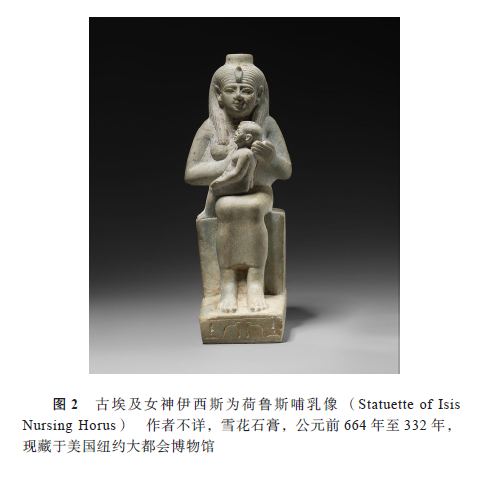 人类很早就认识到母乳的重要性,产生“哺乳崇拜”的文化现象。公元前 18 世纪,在古老的美索不达米亚平原,人们崇拜古巴比伦女神阿斯塔特,她是众神的母亲、人类的缔造者和丰沛乳汁的守护神。成书于公元前 2000 年至1500 年的古印度诗歌集《梨俱吠陀》(Rigveda)大力赞颂母亲的乳房和乳汁,称其为生命的根本[1]。古埃及早期的雕像和绘画就有女神伊西斯给她的儿子荷鲁斯哺乳的形象(图2)。因为荷鲁斯是法老的象征,所以埃及人认为伊西斯的乳汁也给予法老精神上的哺育。“哺乳崇拜”随着马其顿国王亚历山大大帝开疆扩土,逐渐从埃及传到古希腊和古罗马,才有了天后赫拉哺乳的变体。
