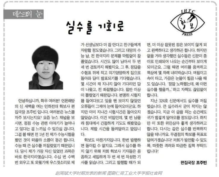 赵周斌大学一年级就开始担任学报社(校内新闻)记者,撰写了许多文章,4个学期中3个学期的平均学分达到4.0以上,还多次获得奖学金。