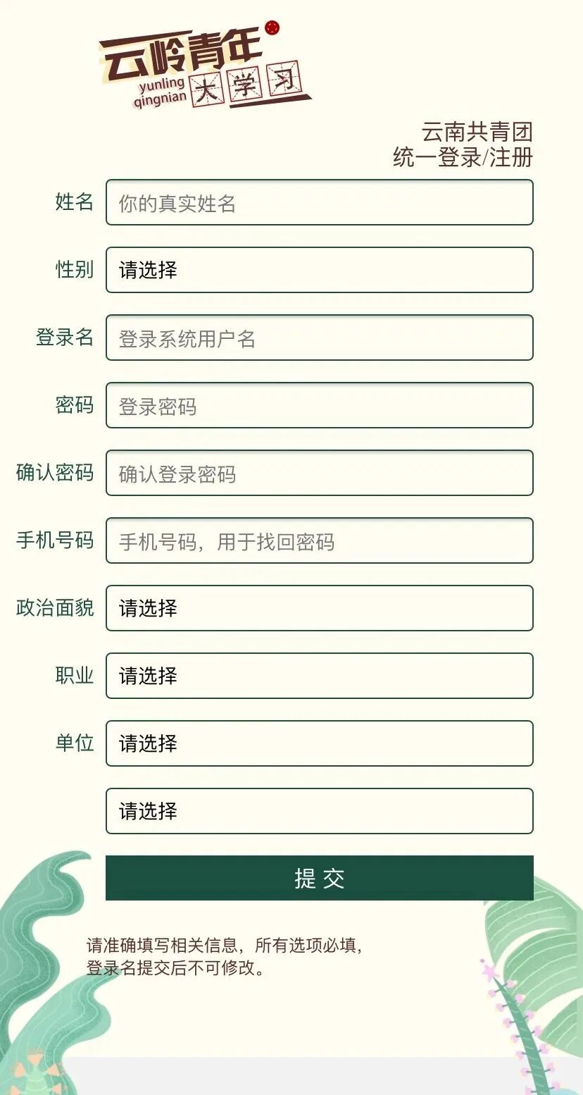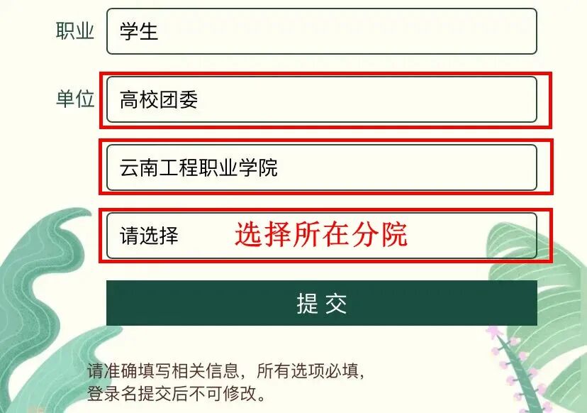 4:填写真实姓名并设置登录名和密码选择政治面貌、职业、所在单位【注意】登录名为登录用的名称,提交以后不能修改!不能使用特殊字符如&!。等请谨慎填写云工小团子请在单位中选择 “ 高校团委 ” 中的 “ 云南工程职业学院 ”和 “ 自己所在的学院 ”