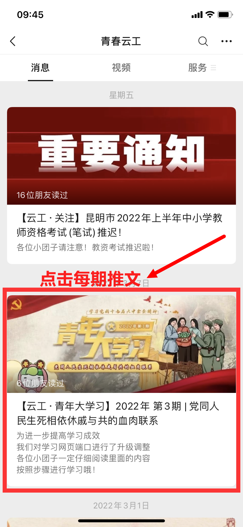 程1:关注 “ 青春云工 ”微信公众号点击 每期推送的 “ 青年大学习推文 ”