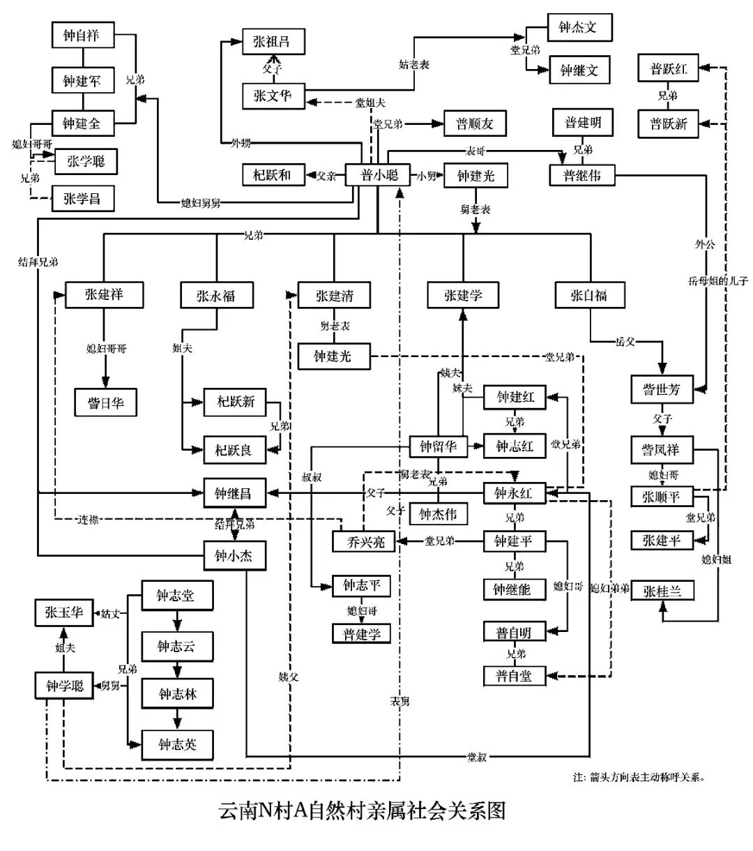费孝通认为,一家人中的亲属关系,由生育或收养而产生的父母和子女;由婚姻而产生的是夫妇,以及翁姑和媳妇,或岳父岳母和女婿……这些是家庭中的基本亲属。可见,在费孝通的视野中亲属关系包含了家族关系。云南的亲属社会存在于自然村内部,没有刻意划分家族和亲戚两种关系,而统一称为亲戚。兄弟堂兄弟也是亲戚,血缘关系与姻缘关系同等重要。