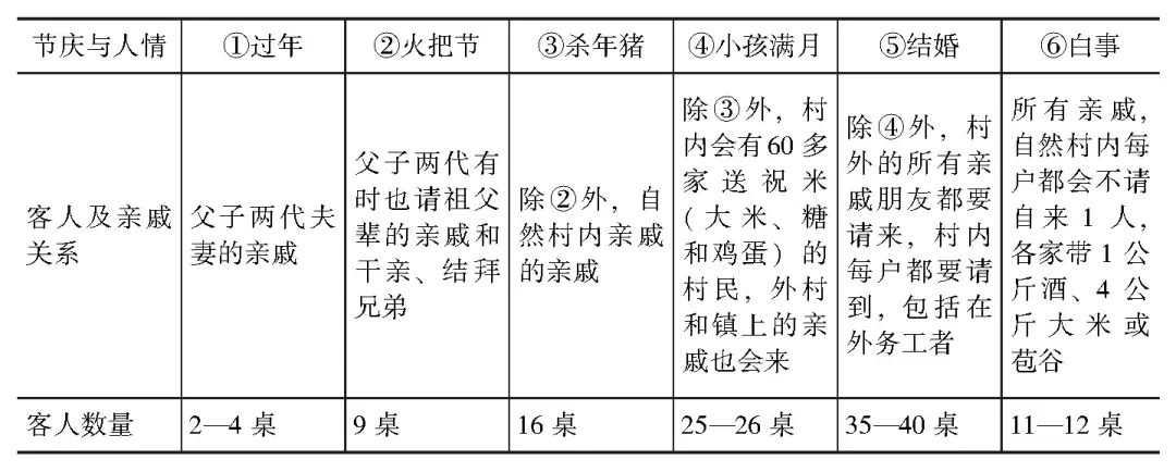 最后,节庆与人情。在A自然村内,办酒席请客吃饭是比较常见的一件事情(见表4),也是亲属社会内部所必需的社会交往。